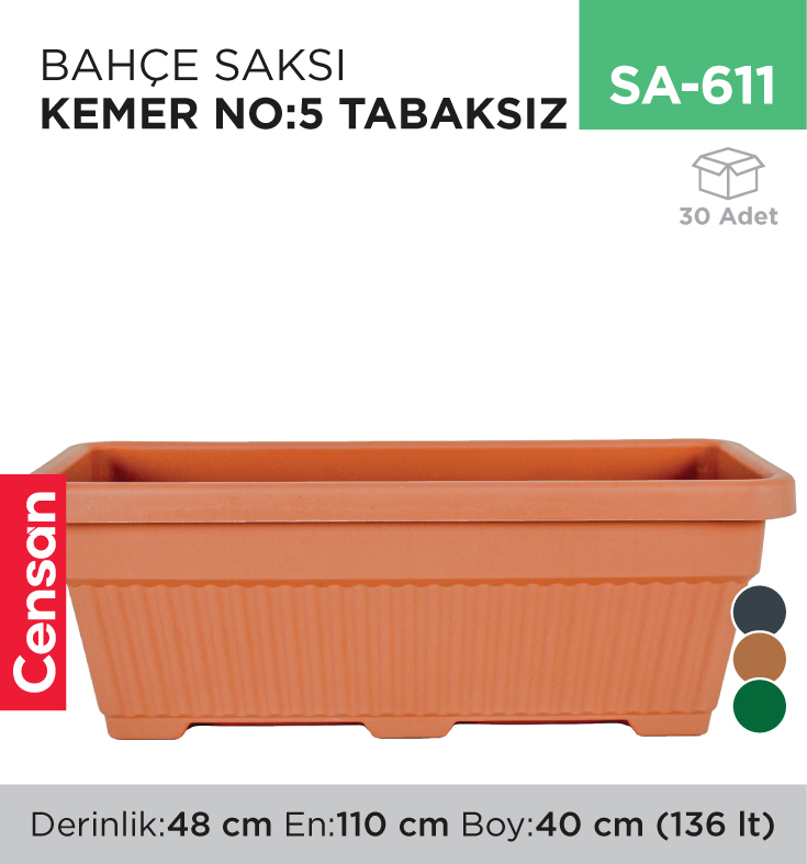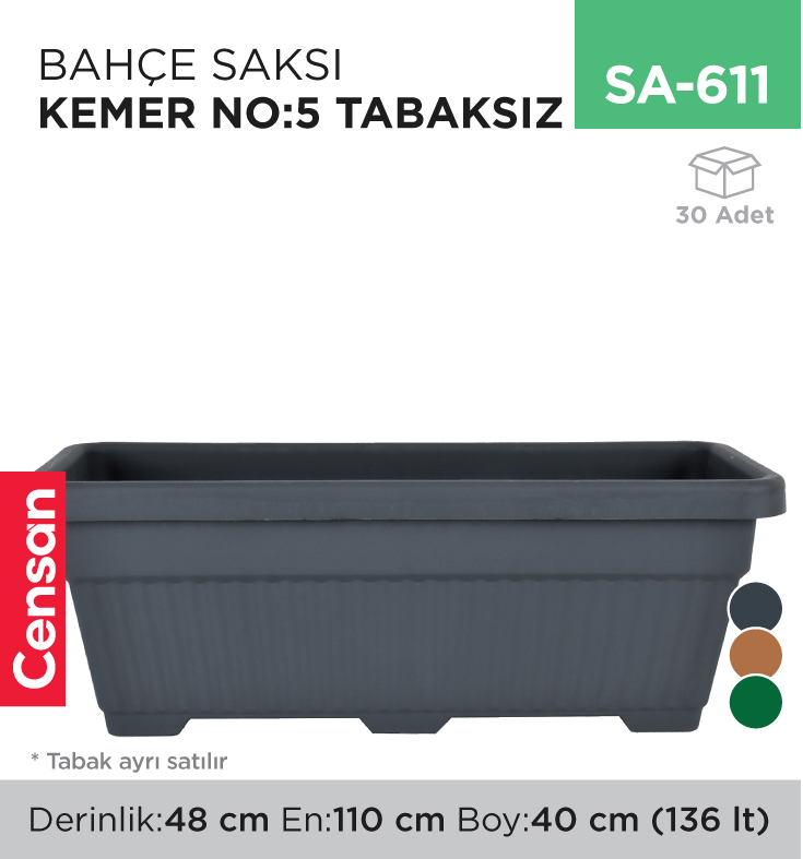 Kurumsal ve bireysel müşterilere yönelik ürün tedariği gerçekleştiren Censan Endüstriyel, geniş ürün portföyü ile hizmet vermektedir. DIŞ MEKAN SAKSILARI, SAKSILAR kategorisi kapsamında yer alan BAHÇE SAKSI KEMER NO:5 (TABAKSIZ) (136 LT) (KBS5) (Stok Kodu: SA-611), farklı kullanım senaryolarına hitap etmektedir.