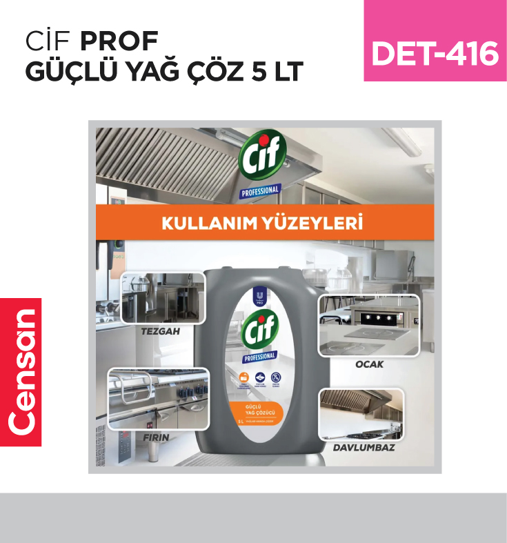 Kurumsal ve bireysel müşterilere yönelik ürün tedariği gerçekleştiren Censan Endüstriyel, geniş ürün portföyü ile hizmet vermektedir. TEMİZLİK KİMYASALLARI, YAĞÇÖZ&KİREÇ ÇÖZ&TUZRUHU kategorisi kapsamında yer alan CİF PROF GÜÇLÜ YAĞÇÖZ 5 LT (Stok Kodu: DET-416), farklı kullanım senaryolarına hitap etmektedir.