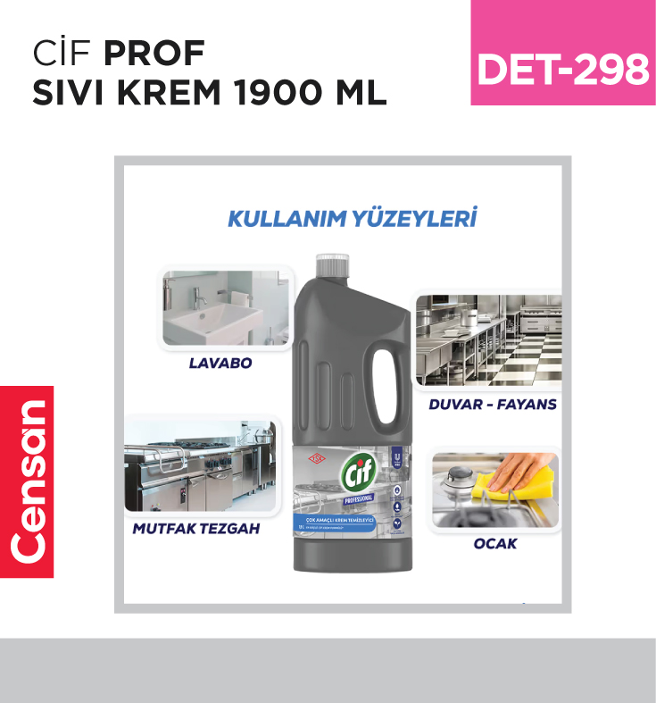Censan Endüstriyel, işletmelerin ve bireysel kullanıcıların ihtiyaç duyduğu ürün gruplarında tedarik çözümleri sunmaktadır. SIVI KREM&OVMA TOZLARI sınıflandırması altında sunulan CİF PROF SIVI KREM 1900 ML (Stok Kodu: DET-298), genel kullanım beklentileri gözetilerek stoklarımızda yer almaktadır.