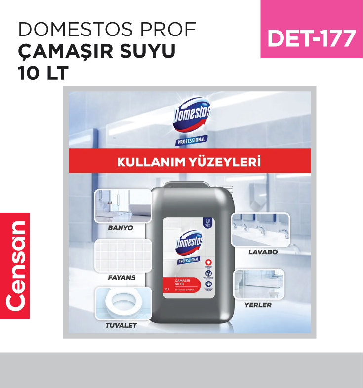 Kurumsal ve bireysel müşterilere yönelik ürün tedariği gerçekleştiren Censan Endüstriyel, geniş ürün portföyü ile hizmet vermektedir. ÇAMAŞIR SULARI, TEMİZLİK KİMYASALLARI kategorisi kapsamında yer alan DOMESTOS PROF ÇAMAŞIR SUYU 10 KG (Stok Kodu: DET-177), farklı kullanım senaryolarına hitap etmektedir.