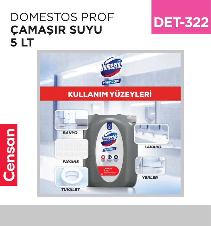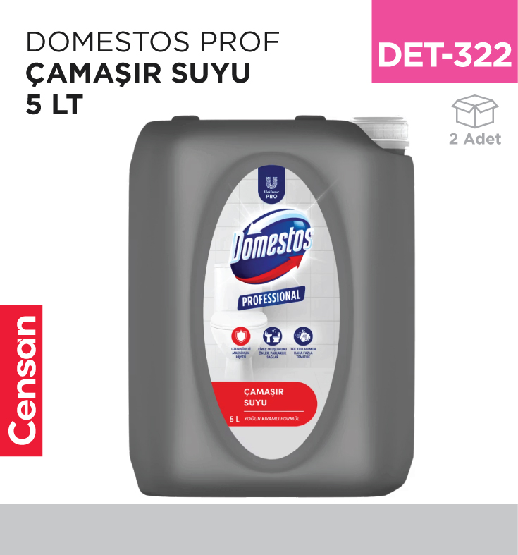 İzmir merkezli Censan Endüstriyel, farklı sektörlere yönelik ürün tedariği sağlayan bir tedarik firmasıdır. ÇAMAŞIR SULARI, TEMİZLİK KİMYASALLARI başlığı altında listelenen DOMESTOS PROF ÇAMAŞIR SUYU 5 LT (Stok Kodu: DET-322), ticari ve bireysel kullanım ihtiyaçlarına uygun olarak satışa sunulmaktadır.