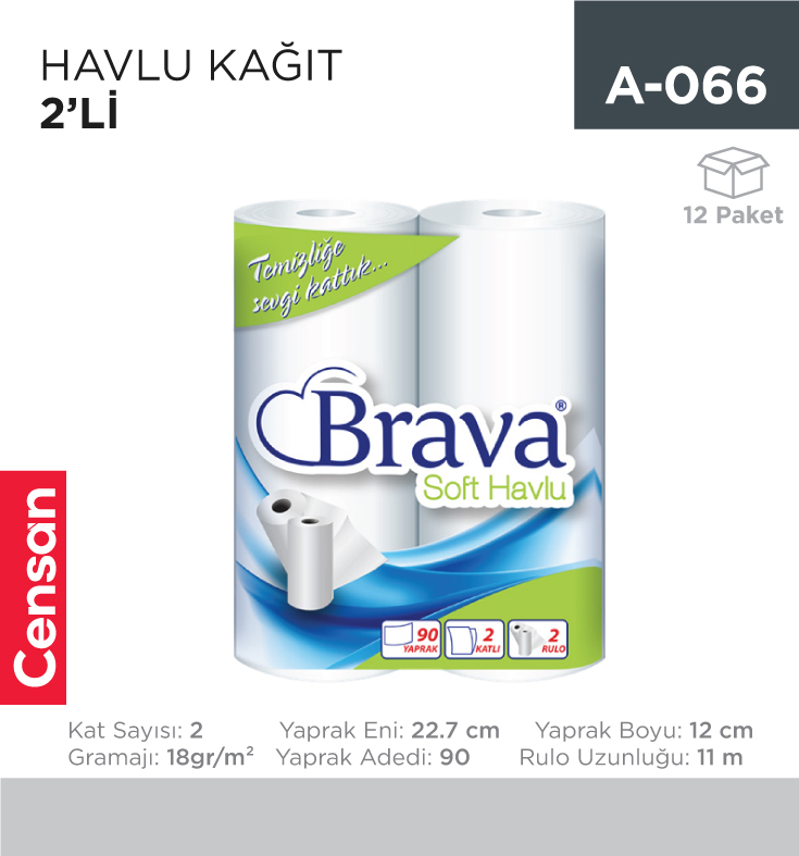 İzmir merkezli Censan Endüstriyel, farklı sektörlere yönelik ürün tedariği sağlayan bir tedarik firmasıdır. KAĞIT HAVLULAR, KAĞIT TEMİZLİK ÜRÜNLERİ başlığı altında listelenen HAVLU KAĞIT 2Lİ BRAVA (3134) (Stok Kodu: A-066), ticari ve bireysel kullanım ihtiyaçlarına uygun olarak satışa sunulmaktadır.