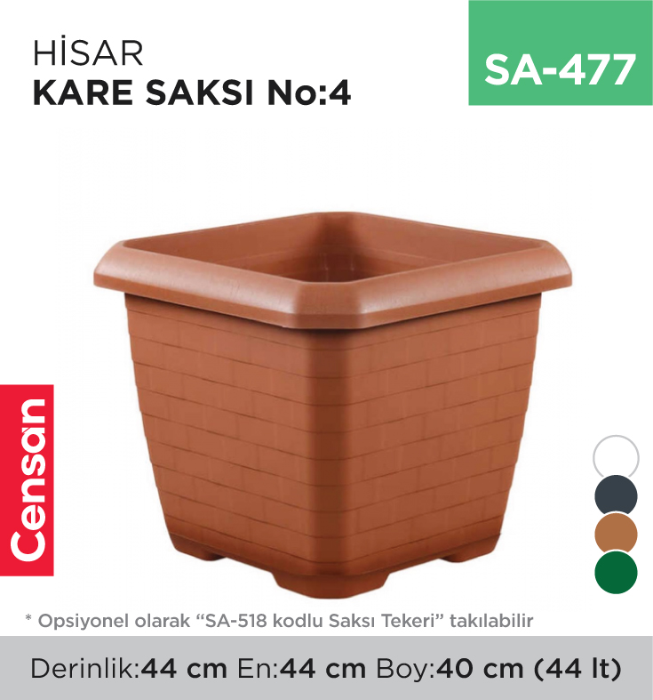 İzmir merkezli Censan Endüstriyel, farklı sektörlere yönelik ürün tedariği sağlayan bir tedarik firmasıdır. DIŞ MEKAN SAKSILARI başlığı altında listelenen HİSAR KARE SAKSI NO:4 TABAKSIZ (44 LT) (HK04) (Stok Kodu: SA-477), ticari ve bireysel kullanım ihtiyaçlarına uygun olarak satışa sunulmaktadır.