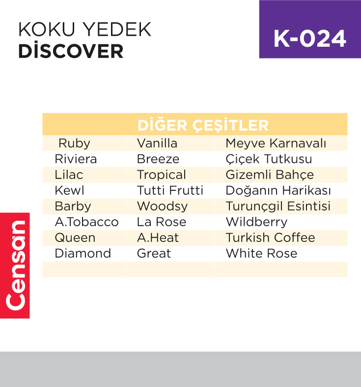 Censan Endüstriyel, işletmelerin ve bireysel kullanıcıların ihtiyaç duyduğu ürün gruplarında tedarik çözümleri sunmaktadır. KOKULAR & TEMİZLEYİCİLER, PARFÜM MAKİNELERİ & YEDEKLERİ sınıflandırması altında sunulan KOKU YEDEK DİSCOVER (DSR0016) (Stok Kodu: K-024), genel kullanım beklentileri gözetilerek stoklarımızda yer almaktadır.